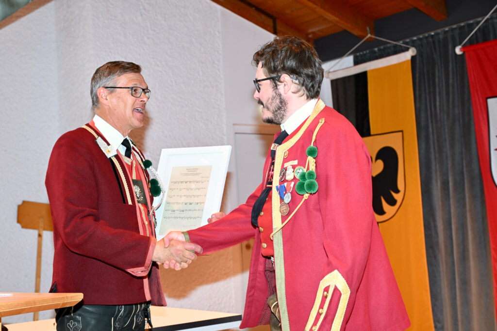 Er berichtet kurz über die Wahlvorschläge für die Neuwahlen des Bundesauschusses, sowie über das Alpenregionsfest in Innsbruck. An diesem Fest nehmen aus dem Viertel Tirol Mitte ungefähr 2.000 Schützen und Marketenderinnen teil.