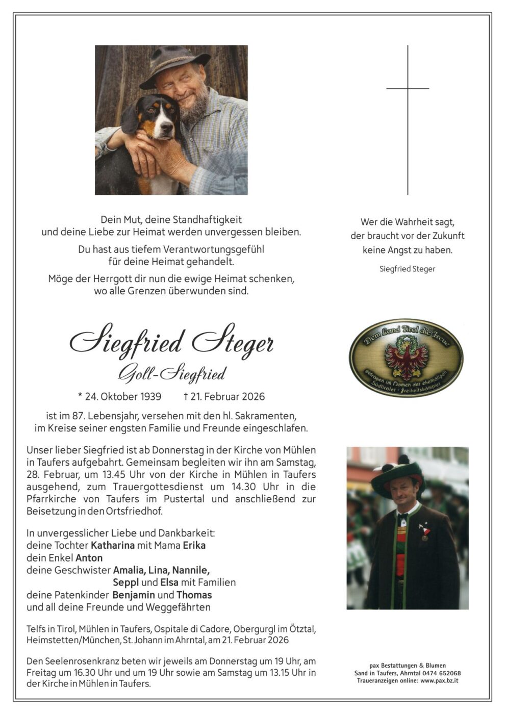 Siegfried Steger musste dafür einen Preis zahlen, den kaum jemand ermessen kann: lebenslanges Exil. Fern der Heimat, fern vom Pustertal, fern von seiner Familie. Besonders schmerzlich war für ihn, dass er nicht einmal an den Begräbnissen seiner Eltern teilnehmen durfte. Ein Sohn, dem es verwehrt blieb, Abschied zu nehmen – das ist eine Tragödie, die über jedes politische Urteil hinausgeht.