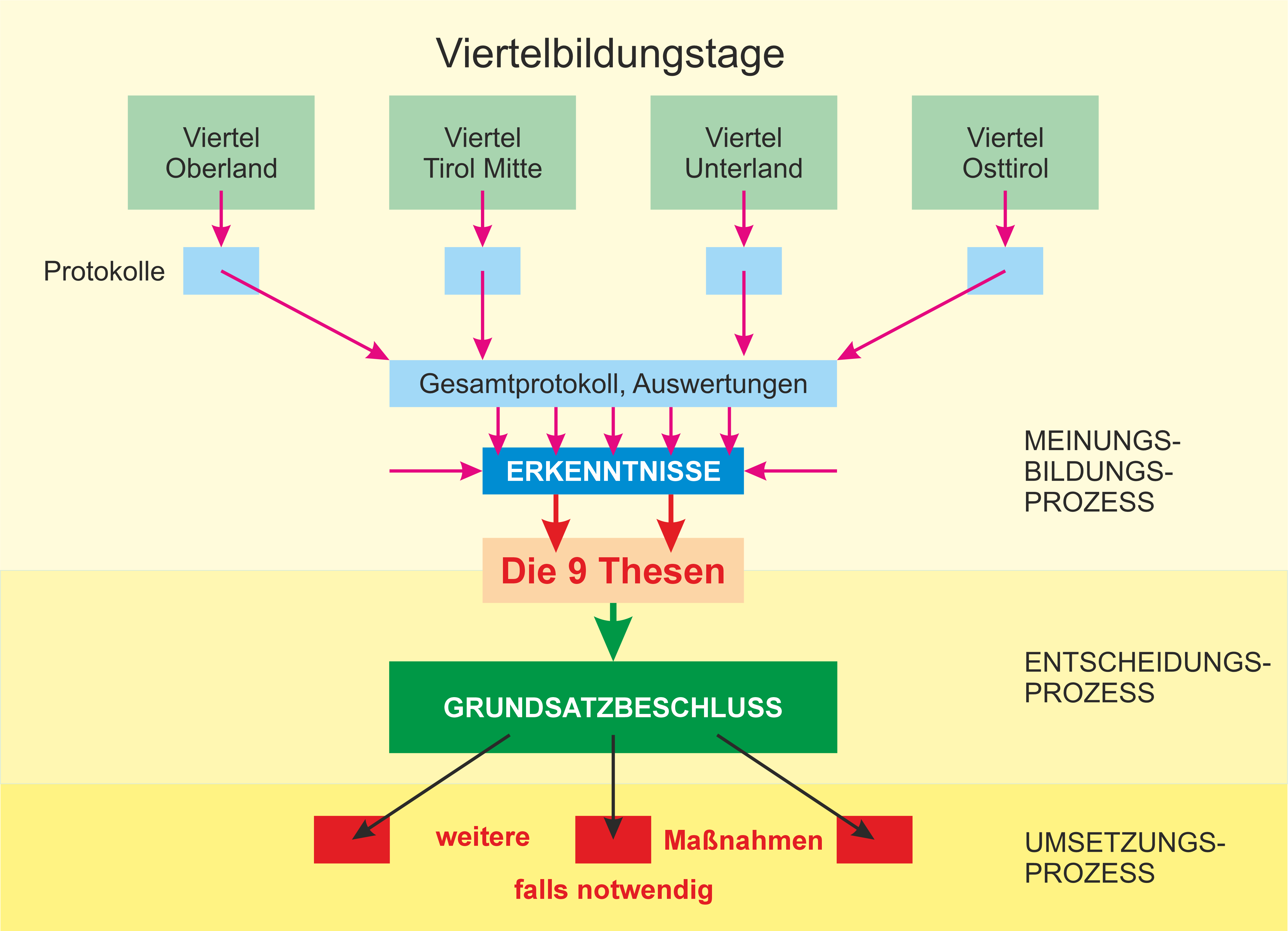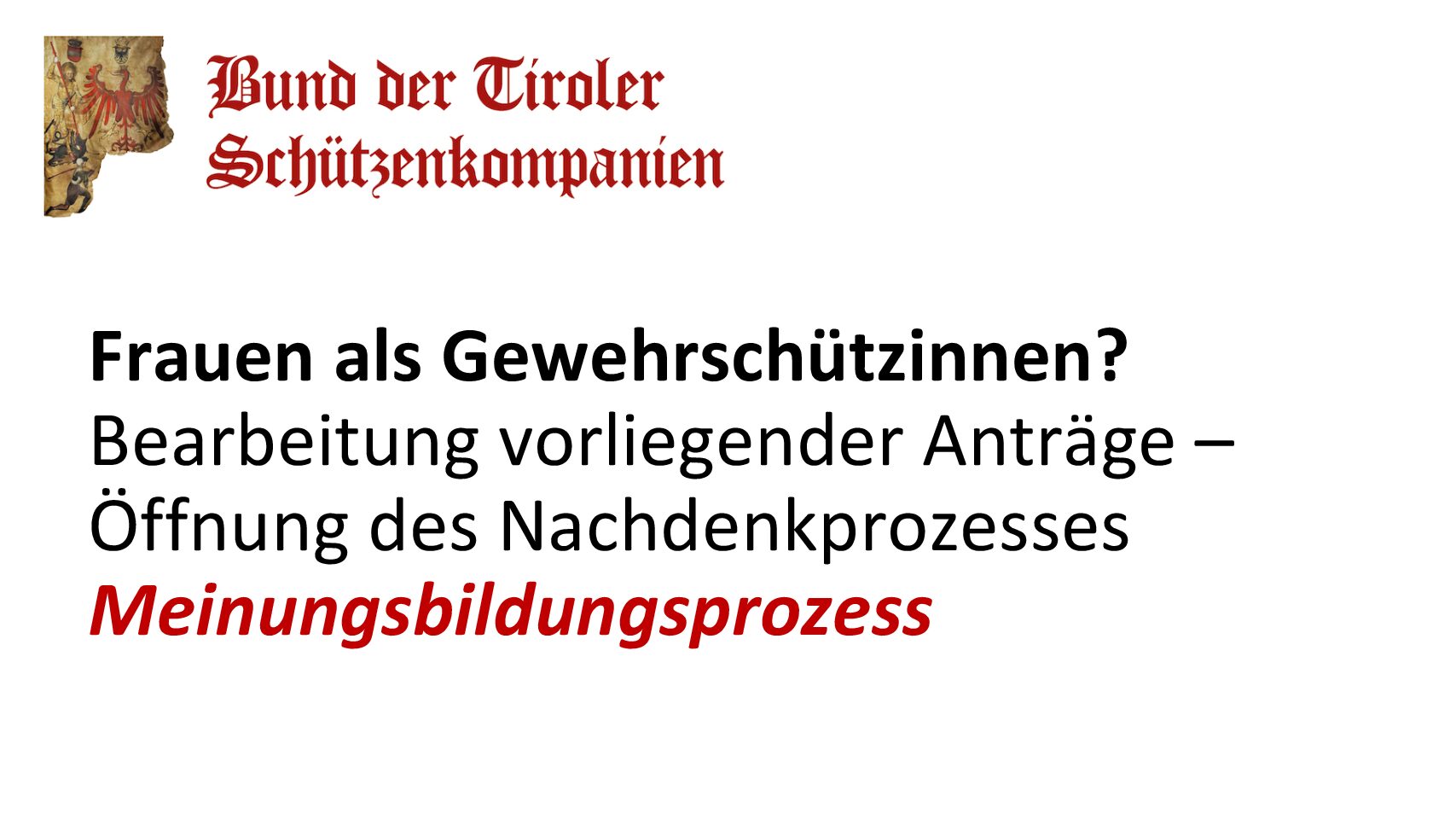 Für die Meinungsbildung wurden in jedem Viertel Bildungstage mit externer Begleitung abgehalten. Eingeladen waren VertreterInnen der Kompanien des jeweiligen Viertels um über das Thema „Frauen als Gewehrschützinnen“ zu diskutieren und die verschiedenen Standpunkte darzulegen. Gesamt nahmen 359 Personen, 270 Männer und 89 Frauen an diesen Bildungstagen teil. Mit einem Anteil von 24,7 % waren dabei die Frauen überproportional im Vergleich zum Frauenanteil aller Mitglieder im BTSK (13,9 %) abgebildet, um damit auch den weiblichen Mitgliedern bei diesem Meinungsbildungsprozess zusätzliches Gehör zu verschaffen.