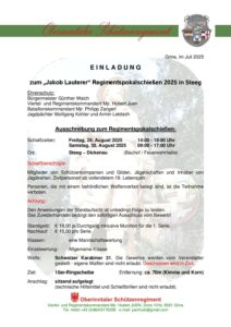 Das diesjährige Regimentspokalschießen findet am 30. Und 31.August 2025 in Steeg statt. Das Schießen ist offen für Mitglieder der Schützenkompanien, Gilden, Jägerschaft und Zivilpersonen ab dem 18. Lebensjahr. Geschossen wird mit den regimentseigenen Schweizer Karabinern 31. Diese Veranstaltung hat sich zum wohl größten Großkalieberschießen Tirols entwickelt.