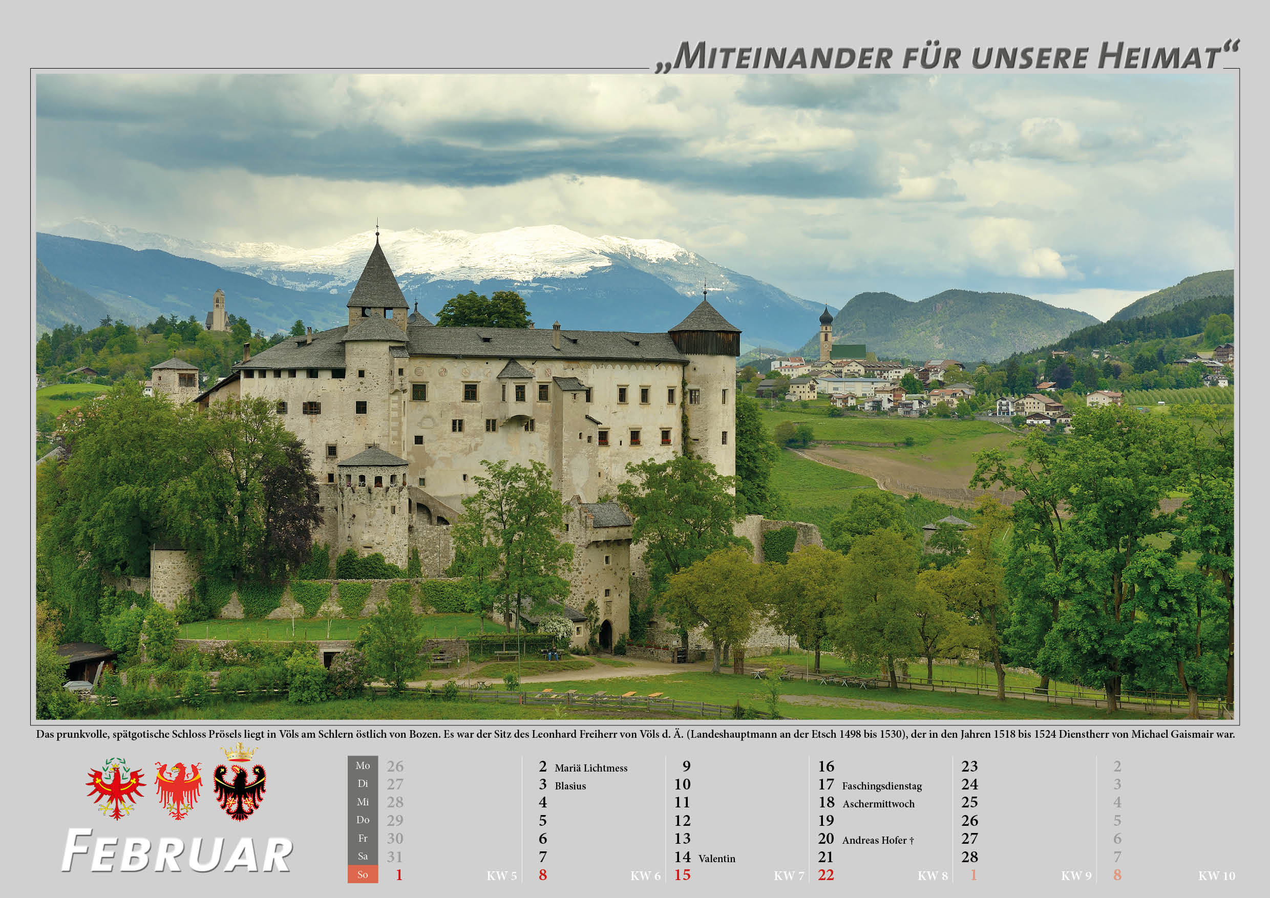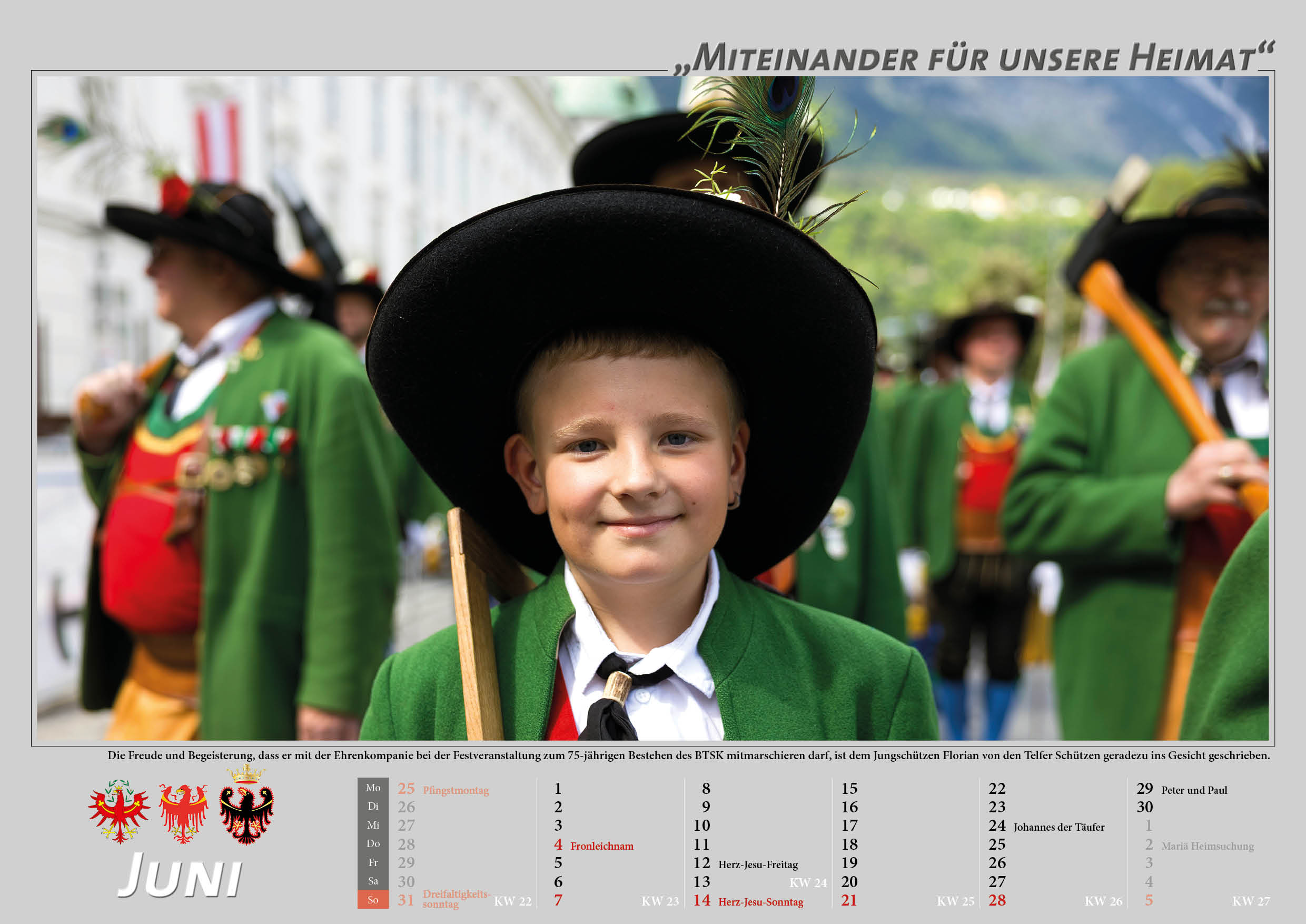 Der Bund der Tiroler Schützenkompanien hat den neuen Tiroler Schützenkalender für das Jahr 2026 herausgebracht. Der beliebte Kalender steht 2026 unter dem Motto „Miteinander für unsere Heimat“ und zieht bildlich Bilanz über die Beteiligung der Schützen an den Veranstaltungen im Jahreslauf, gibt aber auch eine Rückblick auf die Geschichte der Tiroler Schützen bzw. Ereignisse und Orten in allen Tiroler Landesteilen wieder.
