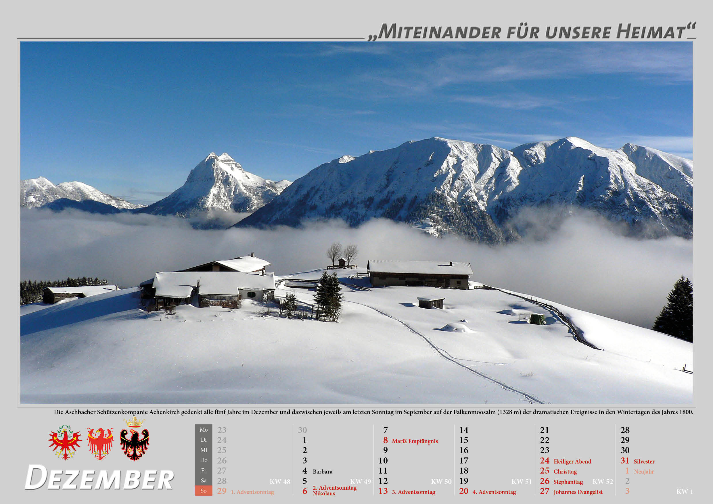 Das besondere am Tiroler Schützenkalender stellt auch heuer wieder die Rückseite der einzelnen Kalenderblätter dar, auf diesen wird in gewohnter Weise das Thema der Vorderseite mit geschichtlichen Fakten und Wissenswertem aufgearbeitet.